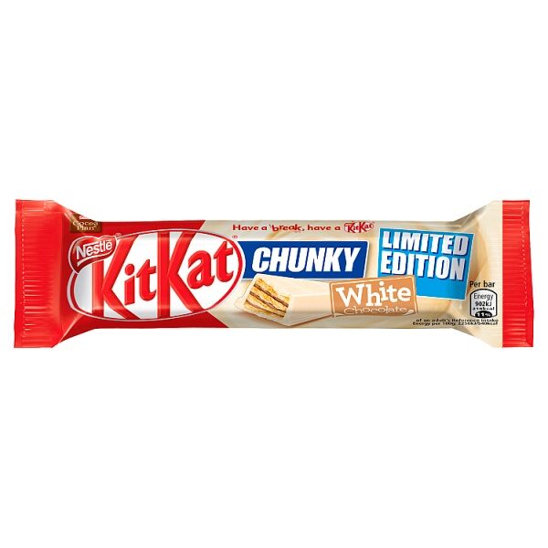 - Unwrap, snap off a chunk and enjoy the delicious smooth white chocolate and crispy wafer of KITKAT Chunky White Chocolate. KITKAT Chunky launched in 1999, and is the biggest innovation for KITKAT since its launch in 1935. You can choose from the classic KITKAT Chunky Milk or mix your break up and pick up a KITKAT Chunky Peanut Butter. If you want an even bigger break, go for KITKAT Chunky Duo. KITKAT Chunky uses sustainably sourced cocoa from the Nestle Cocoa Plan. In 2016, KITKAT celebrated becoming the first 100% globally certified sustainably sourced brand! The Nestle Cocoa Plan works with UTZ to ensure a better future for cocoa farmers and even better chocolate for you. Thanks to The Cocoa Plan, no matter where in the world you buy a KITKAT, you know that the cocoa used to make its delicious chocolate layer was responsibly sourced. With its perfect chocolate to wafer ratio, KITKAT is the perfect companion for any break. You can enjoy KITKAT as the iconic KITKAT 4 Finger, KITKAT Chunky, KITKAT 2 Finger and the newest addition; KITKAT Senses. So, whoever you are and however you break, Have a break, have a KITKAT?